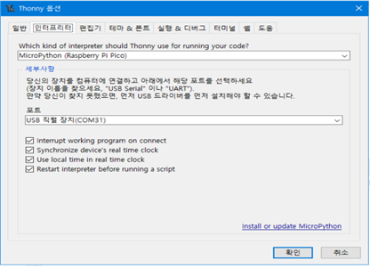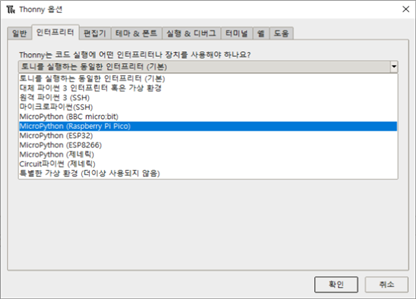 (13) Thonny 옵션에 인터프리터 항목에서 마이크로 파이썬 PICO 보드를 선택해주면 됩니다.