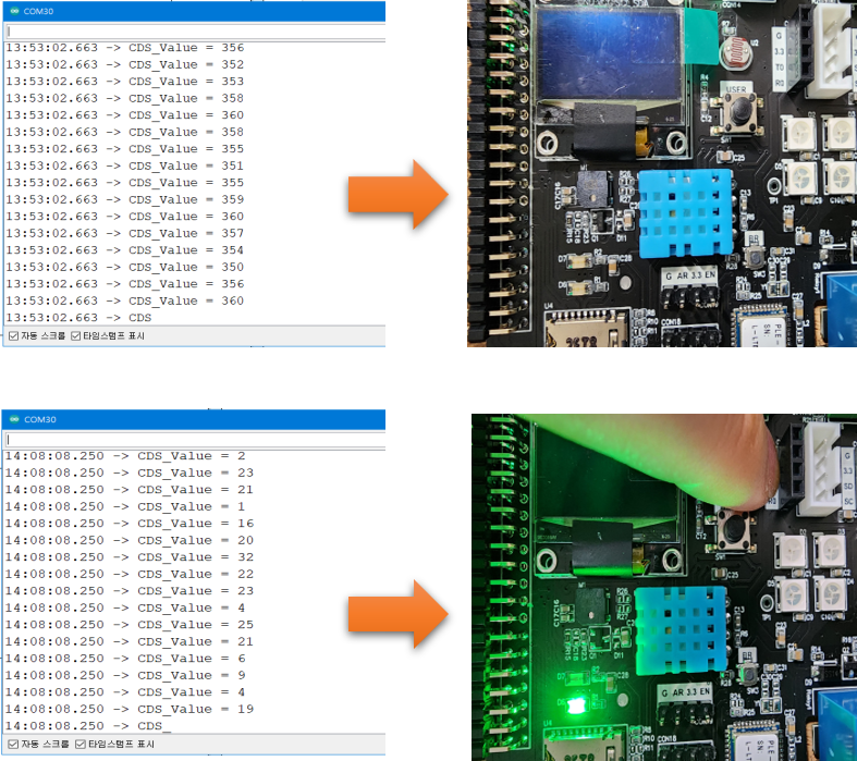 CDS값이 높을 때는 LED불이 안들어 오다가 CDS값이 250 보다 낮아지면 LED가 켜집니다.