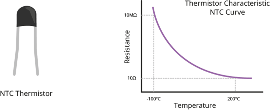 DHT11에는 온도를 측정하기 위한 NTC/서미스터도 포함되어 있습니다. 서미스터는 온도에 따라 저항이 크게 변하는 열 저항기입니다. "NTC"라는 용어는 "음의 온도 계수"를 의미하며 온도가 증가함에 따라 저항이 감소한다는 의미입니다.