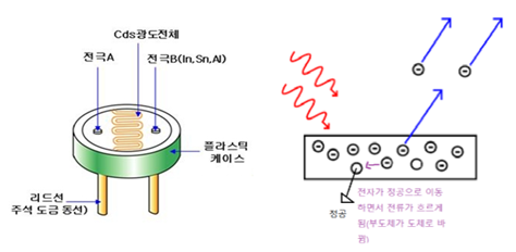 CDS는 반도체에 빛이 닿으면 전자의 움직임과 정공의 갯수가 증가하고, 조사된 빛 에너지에 비례하 여 전류가 증가하는 원리를 이용한 소자입니다.