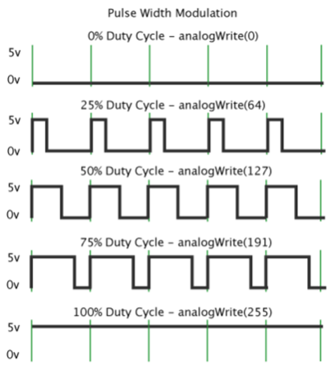 PWM은 가장 일반적인 전압 제어 방법입니다. 일정한 주기에서, 출력이 필요로 하는 만큼의 전력을 스위치 ON하여 입력으로부터 공급받습니다. 따라서, 필요한 출력전력에 따라 ON / OFF의 비율, 듀티 사이클 (duty cycle)이 달라집니다. 듀티비가 클수록 모터에 전류가 흐르는 전체 시간이 길어집니다.