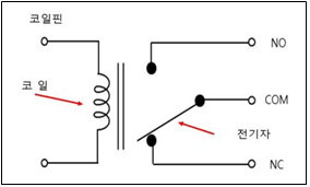 릴레이의 내부는 아래 그림과 같이 코일과 전기자, 그리고 코일핀과 NO, COM, NC 핀으로 구성되어 있습니다.