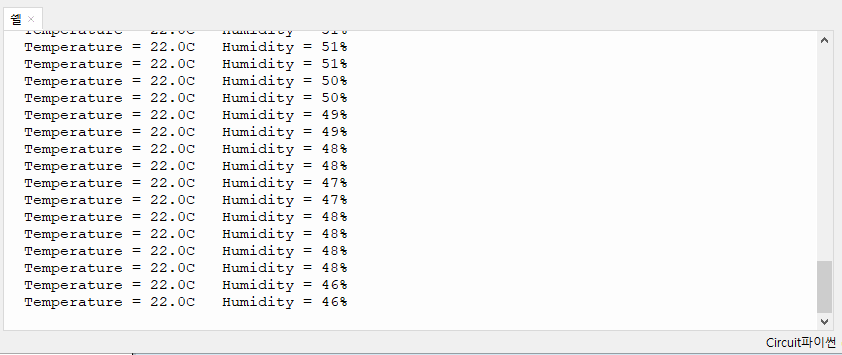 DHT11은 정수로 출력되며 DHT22는 소수 1째자리 까지 출력됩니다.