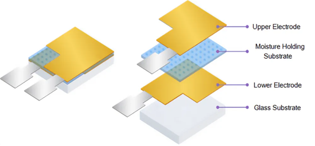습도 감지 구성 요소에는 수분 보유 기판이 사이에 끼인 두 개의 전극이 있습니다.