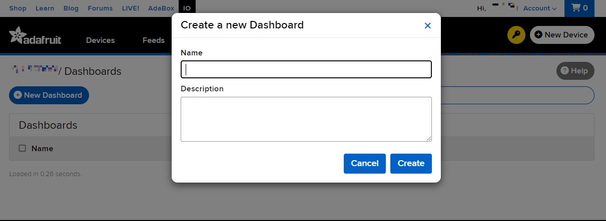 Dashboard 생성도 Feed 와 같이 이름과 설명을 적어 생성하면 됩니다.