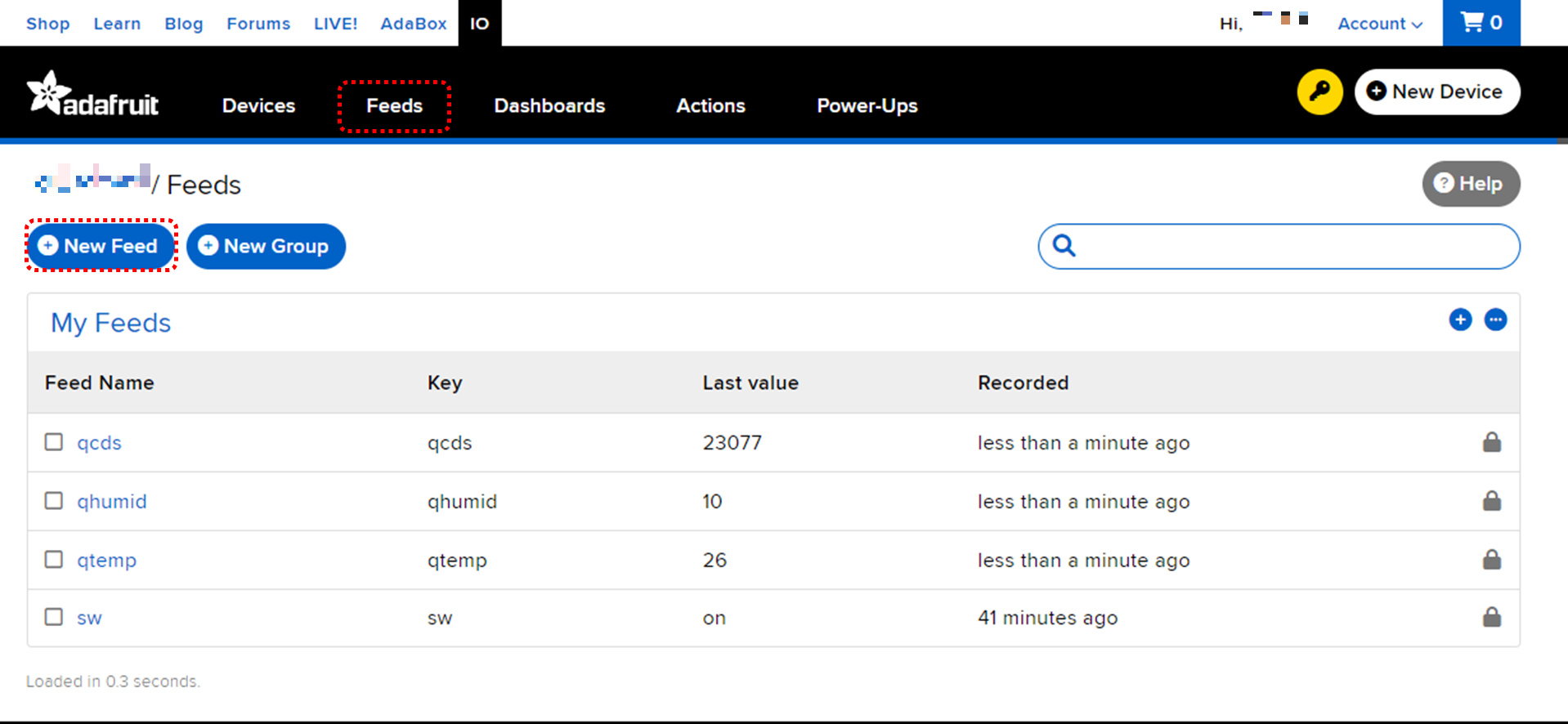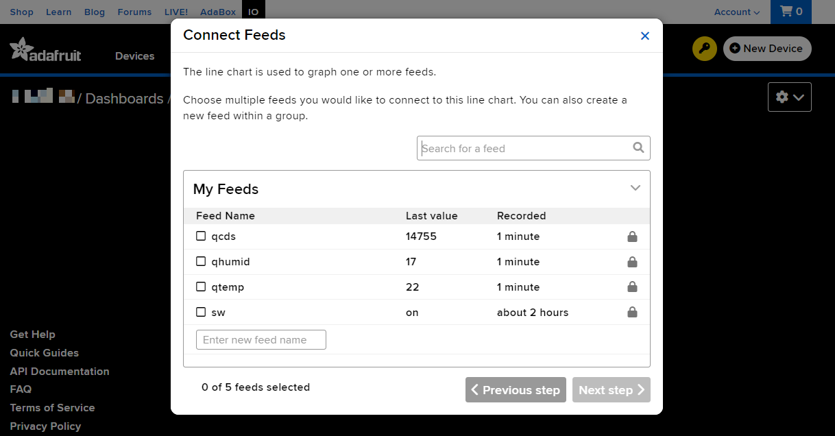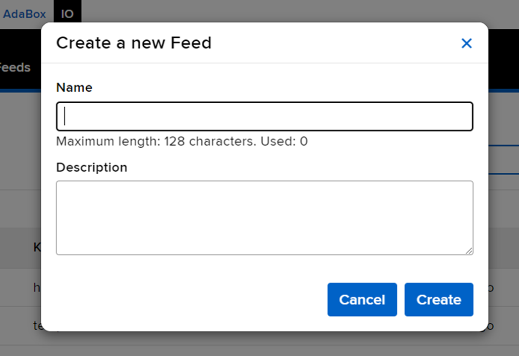 Feeds 탭은 데이터를 업로드할 변수라고 생각하시면 됩니다. 처음에는 비어있지만 New Feed를 선택하여 생성하면 됩니다.