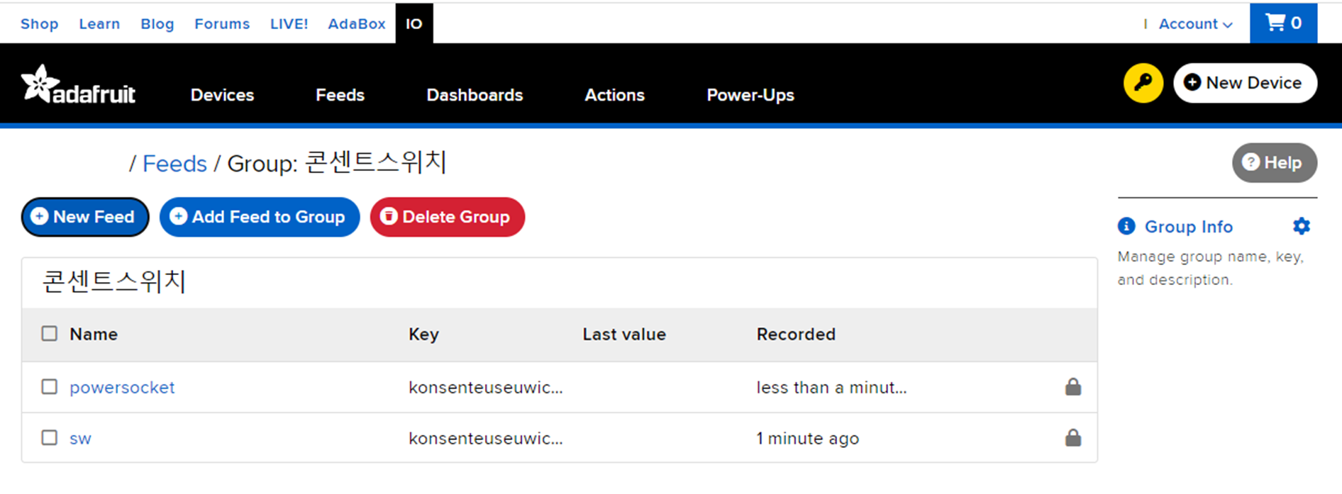 다음은 adafruit 사의 IO 클라우드에서 Feed 를 만들어보겠습니다. 그룹생성을 하여 콘센트스위치그룹에 powersocket, sw 를 만들어보겠습니다.