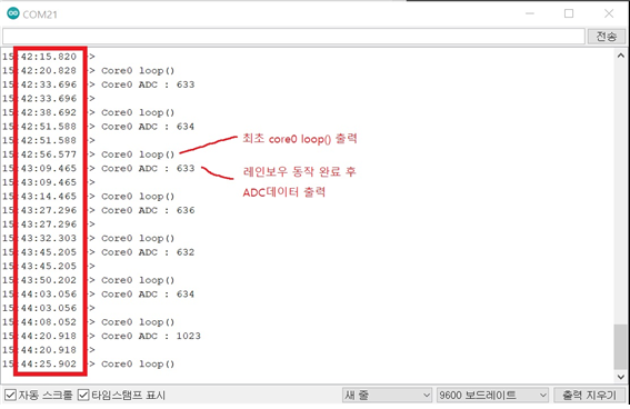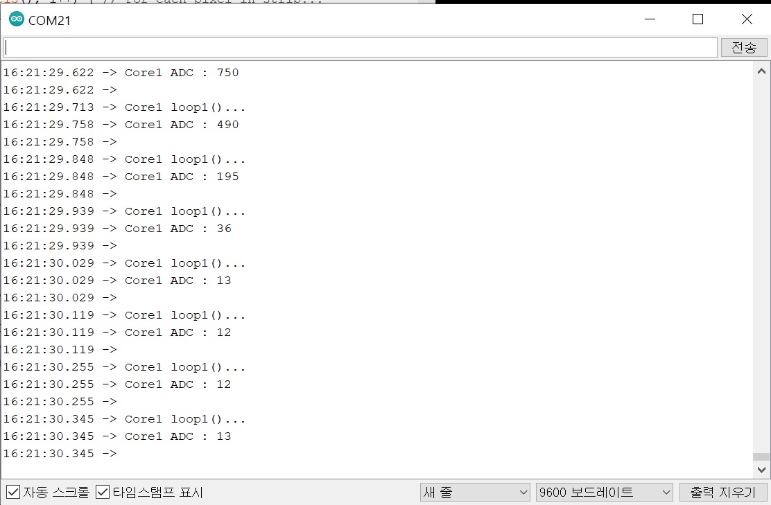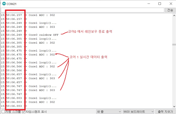 그럼 듀얼코어를 이용하여 레인보우 동작 중 가변저항 데이터를 받아오는 결과를 확인 하겠습니다.