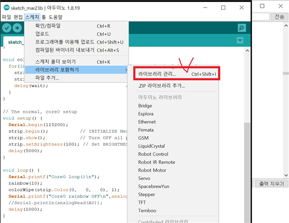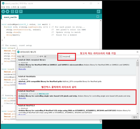 예제 실험을 하기 위해서는 라이브러리를 설치해야 합니다. 설치되는 라이브러리는 WS2812를 이용하기 위한 “neopixel“입니다.