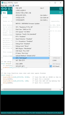 아래와 같이 실행 => 툴 => 포트 => UF2 Board 실행