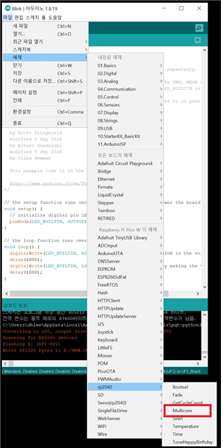 파일 => 예제 => rp2040 => multicore를 실행하여 업로드 합니다.
