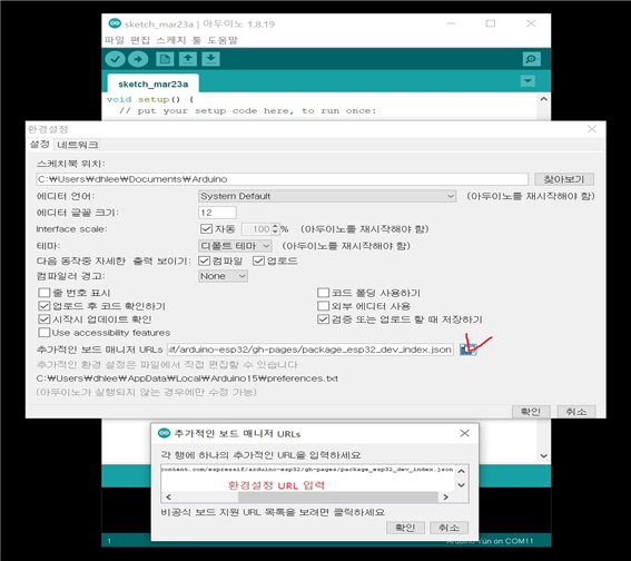 환경설정이 완료 되었으면 arduinoIDE를 종료했다 다시 실행을 합니다.