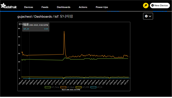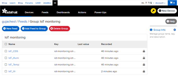 위와 같이 조금씩 진해하시면 adafruit IO 서비스를 이용하여 IoT시스템을 구현 할 수 있습니다.