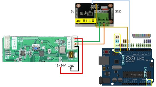 아래의 코드는 아두이노와 RS485보드를 연동하여 4채널 릴레이 보드를 RS485 / I2C 통신을 이용하여 제어 하는 기본 프로그램 입니다.