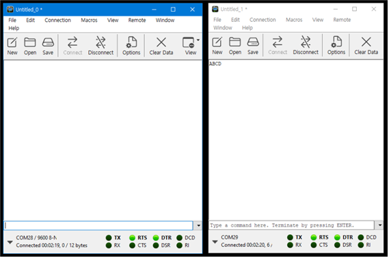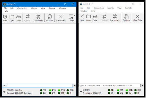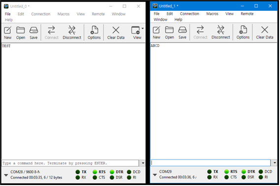 통신이 되면 TX LED 와 RX LED가 전송할 때 마다 깜빡거립니다.
