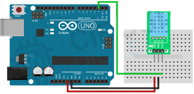 연결은 매우 간단하며 세 개의 전선만 필요합니다. 모듈의 VCC와 GND를 아두이노의 5V와 GND 핀에 연결합니다. 그런 다음 DATA 핀을 Arduino의 디지털 핀 2에 연결합니다. 이 핀을 통해 DHT11과 통신합니다.