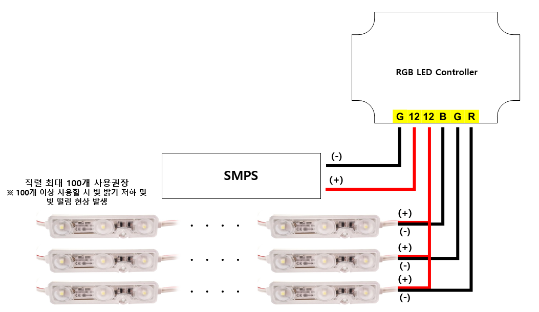 (2) 12V용 RGB LED 모듈 최대 300개 연결 가능(아래 연결 방법 참조)