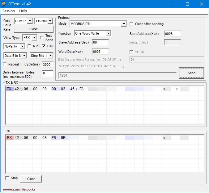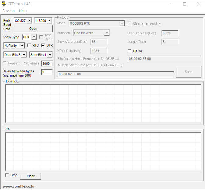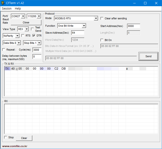 TX : 40 05 00 00 00 00 C2 DB - > 주소 0x40 0번 릴레이 OFF