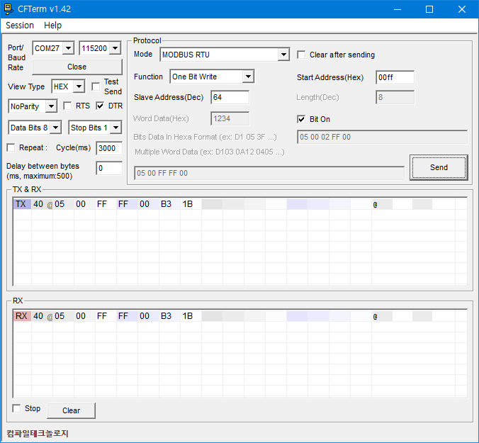 TX : 40 05 00 03 FF 00 73 2B - > 주소 0x40 3번 릴레이 ON